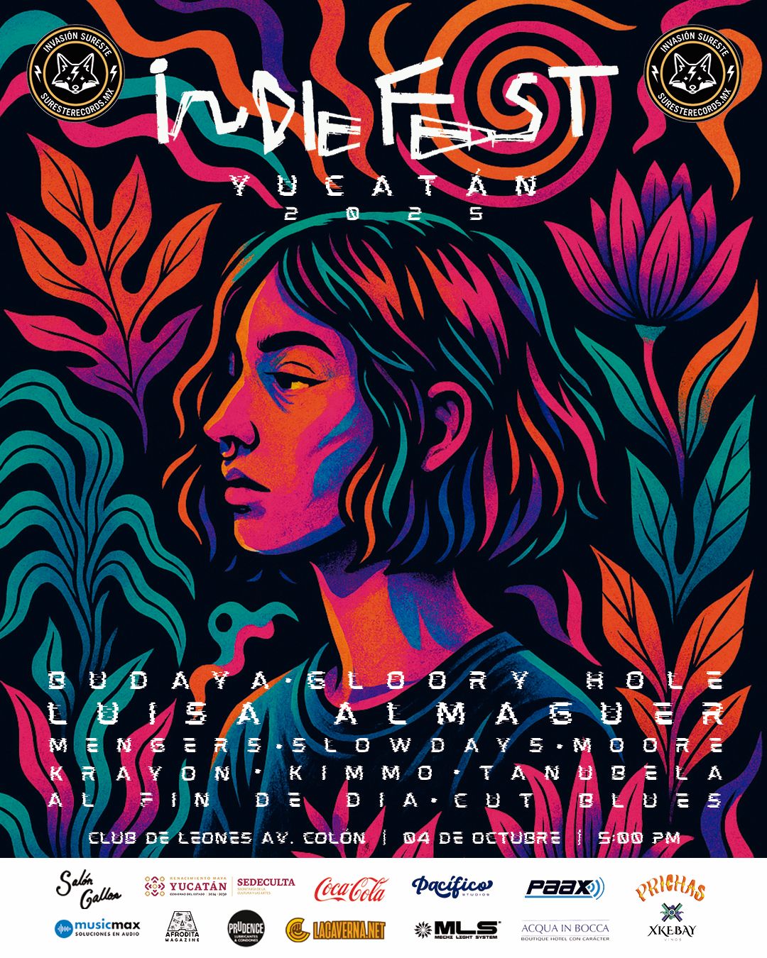 Un ejemplo es Luisa Almaguer, cuyas letras profundas y estética sonora la han convertido en una figura clave del pop conceptual en México; también se presentarán los Mengers con mucho punk garage crudo y explosivo que vienen a encender a todo Mérida y Gloory Hole llenxs de irreverencia, performance y ritmo: una propuesta sonora inclasificable con base en la disidencia creativa. Igualmente nos acompañaran el dueto Budaya con sus ritmos electrónicos nostalgicos que fusionan con generos como el edm, funk, trip hop, dream pop con mucha experimentación lírica en sus voces, excelente para poner a bailar a todxs. Además de todos estos proyectos se sumarán algunos proyectos locales que actualmente se han destacado por sus propuestas, performances y shows en vivo como Kimmø, Tanúbela, Slow Days, Moore, así como bandas que cuentan con mucha experiencia en la escena yucateca como Cut Blues, Al fin del dia y Krayón, reafirmando el compromiso del festival con el talento local.